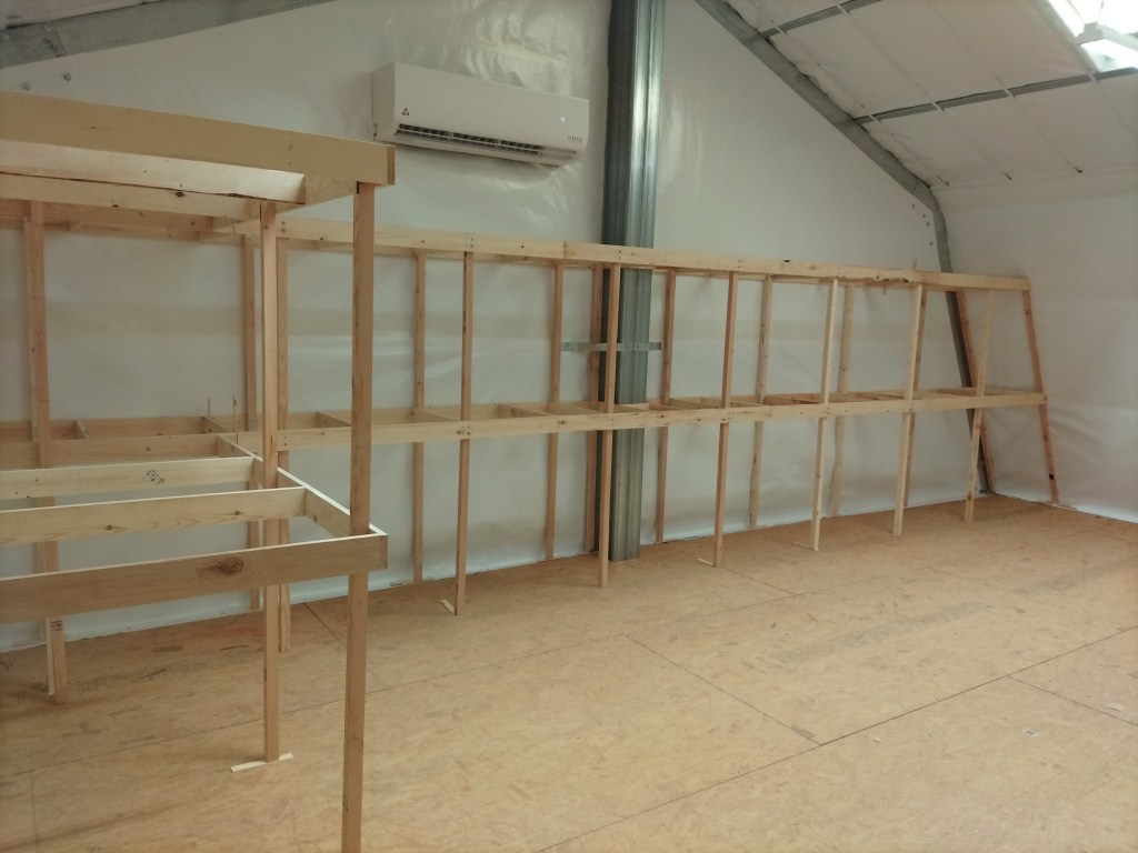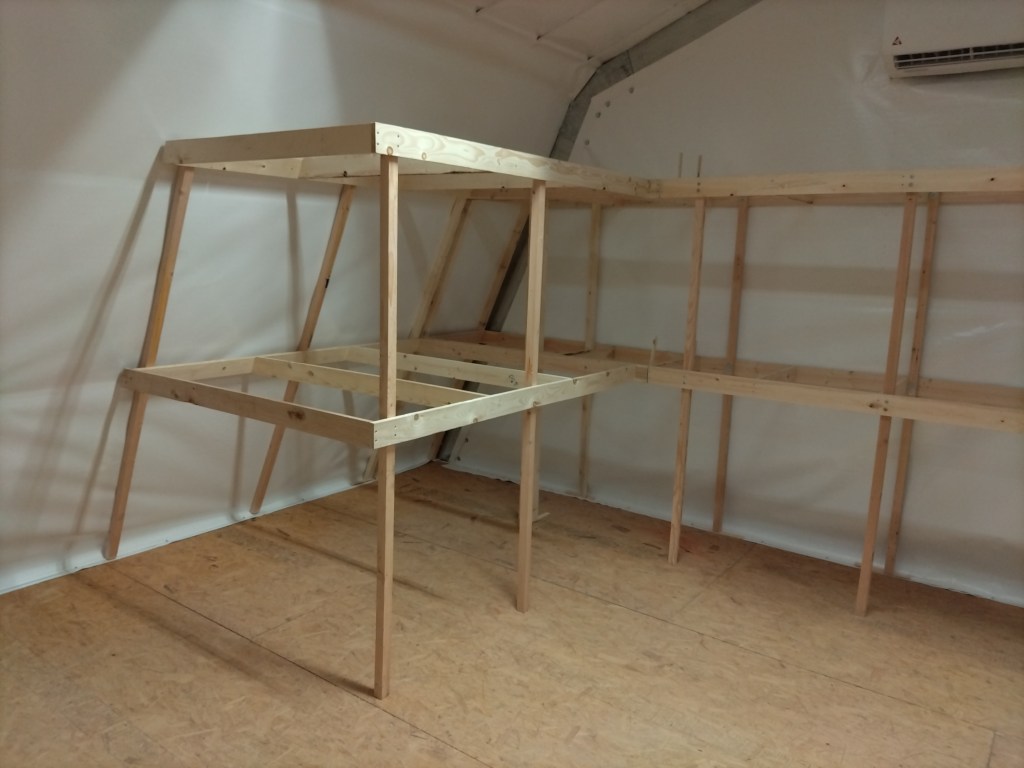 What’s shown in the two pictures are six bench modules, each about five to six feet wide. I estimate 28 modules will be needed to go completely around the wall. The walls are actually part of the Gambel roof, hence the slant.